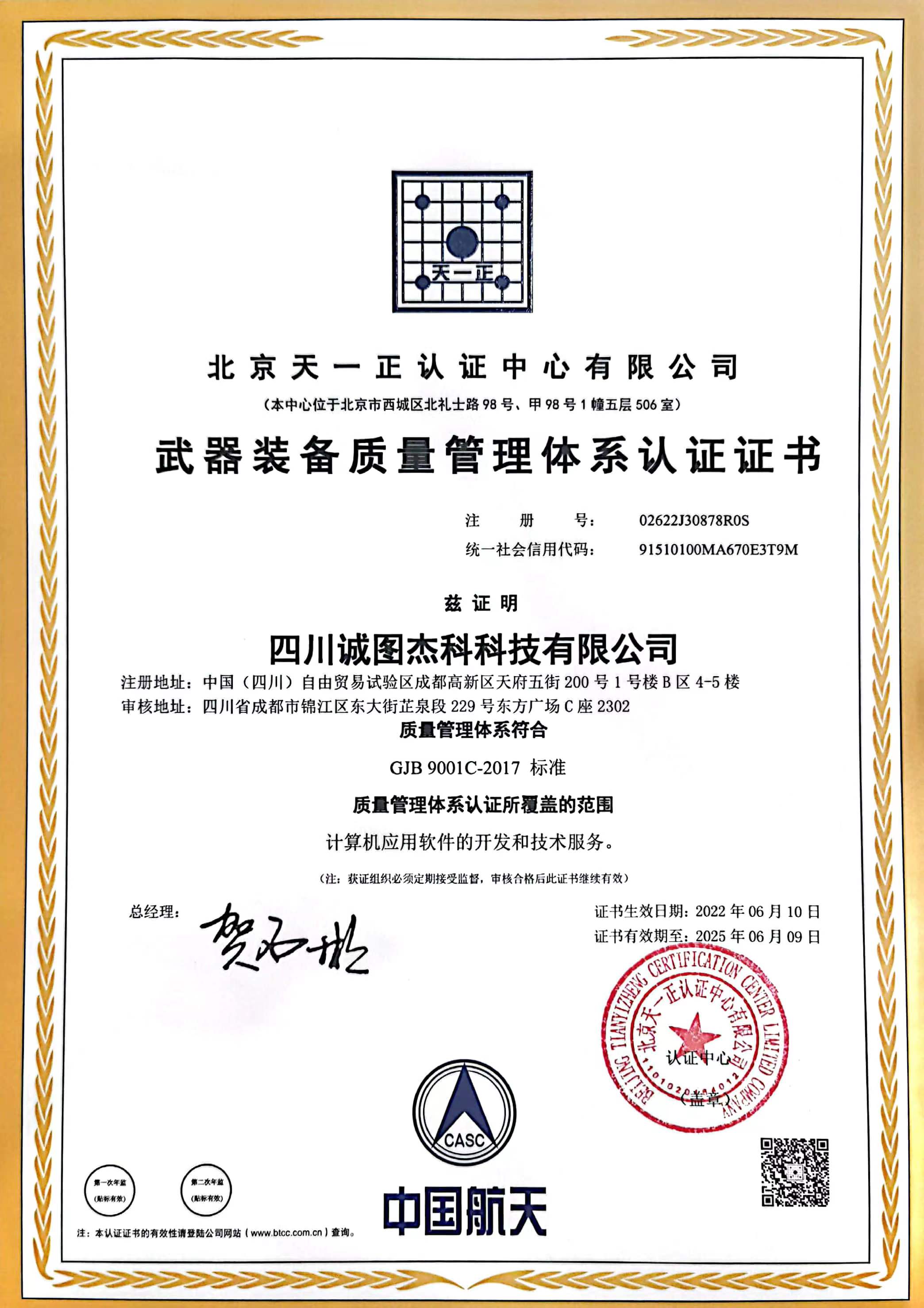 公司资质完备,拥有保密资格证书,并通过国家标准质量管理体系认证、武器装备质量管理体系认证、环境管理体系认